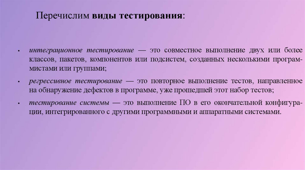 Перечислим виды тестирования:интеграционное тестирование — это совместное выполнение двух или более