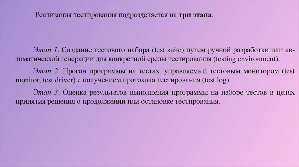 Реализация тестирования подразделяется на три этапа.Этап 1. Создание тестового набора (test suite) путем ручной разработки или автоматической генерации для конкретной среды тестирования (testing environment).
