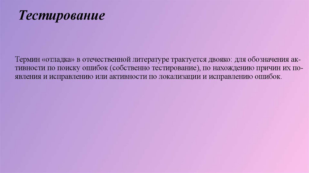 ТестированиеТермин «отладка» в отечественной литературе трактуется двояко: для обозначения активности по поиску ошибок (собственно тестирование), по нахождению причин их появления и исправлению или активности по локализации и исправлению ошибок.