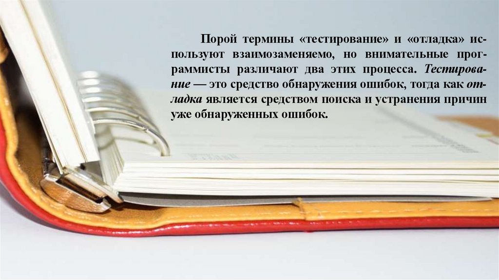 Порой термины «тестирование» и «отладка» используют взаимозаменяемо, но внимательные программисты различают два этих процесса. Тестирование — это средство обнаружения ошибок, тогда как отладка является средством поиска и устранения причинуже обнаруженных ошибок.