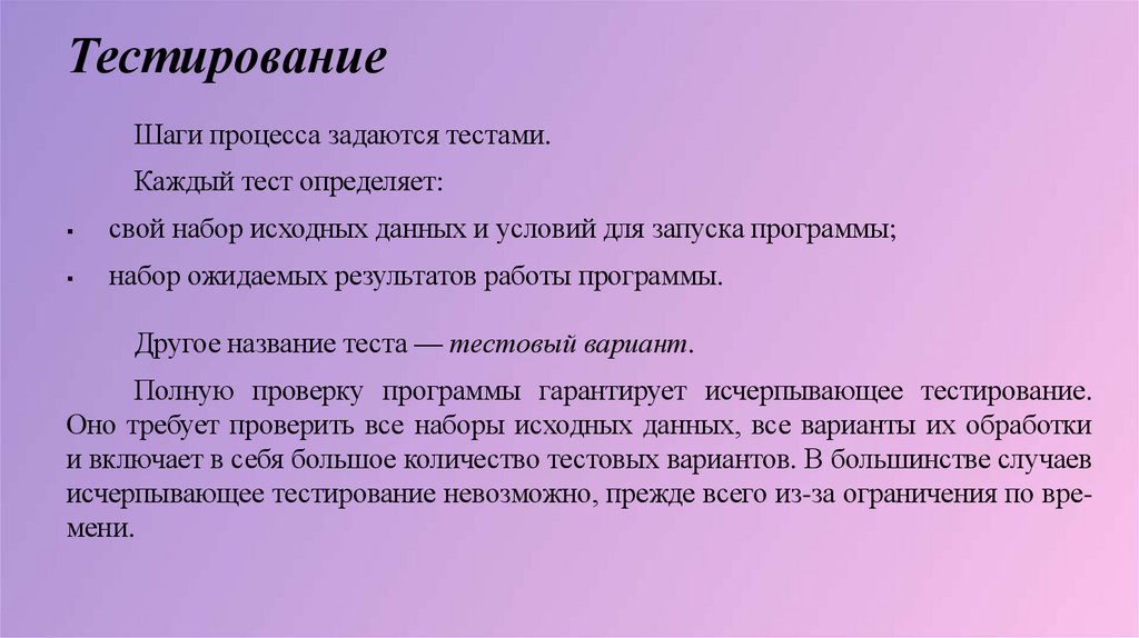 исчерпывающее тестирование невозможно, прежде всего из-за ограничения по времени.