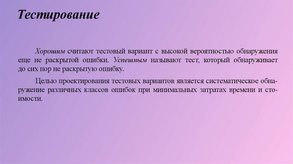 ТестированиеХорошим считают тестовый вариант с высокой вероятностью обнаружения