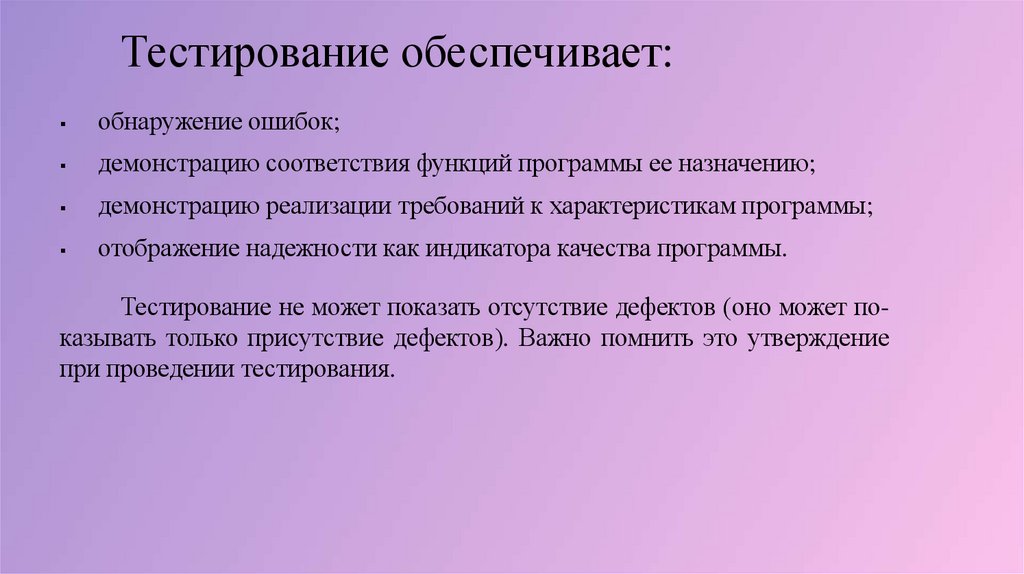 Тестирование никогда не доказывает отсутствие ошибок. Отсутствие ошибок
