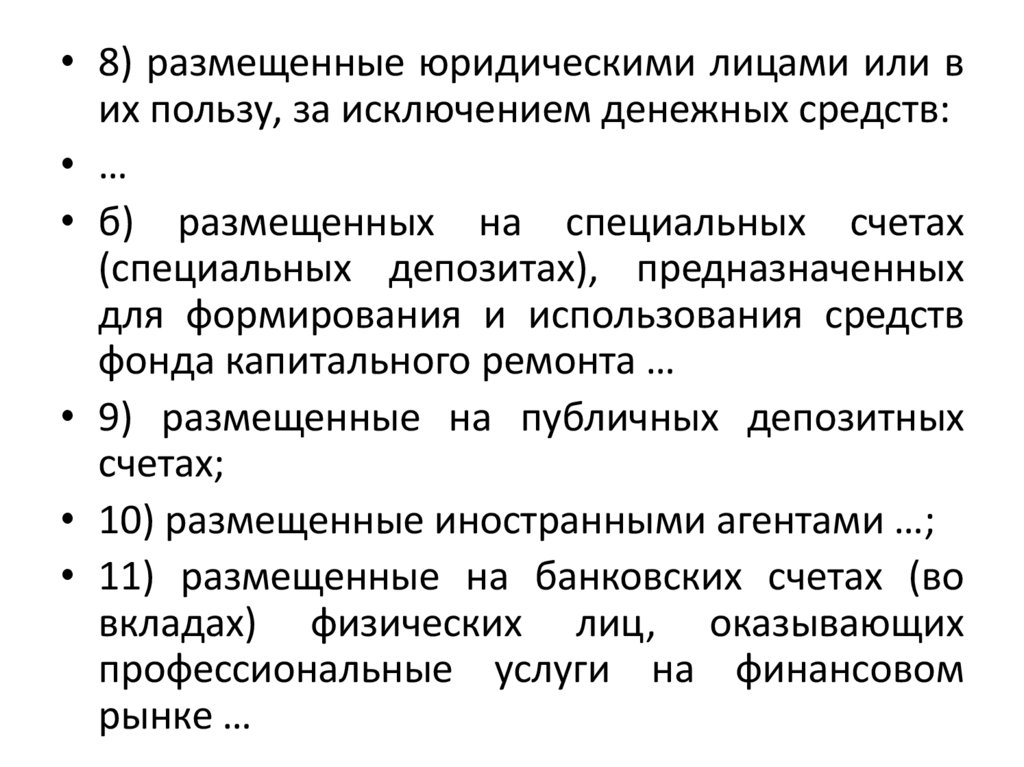 - Средства на номинальных, залоговых и эскроу-счетах, а также средства юридических лиц, кроме