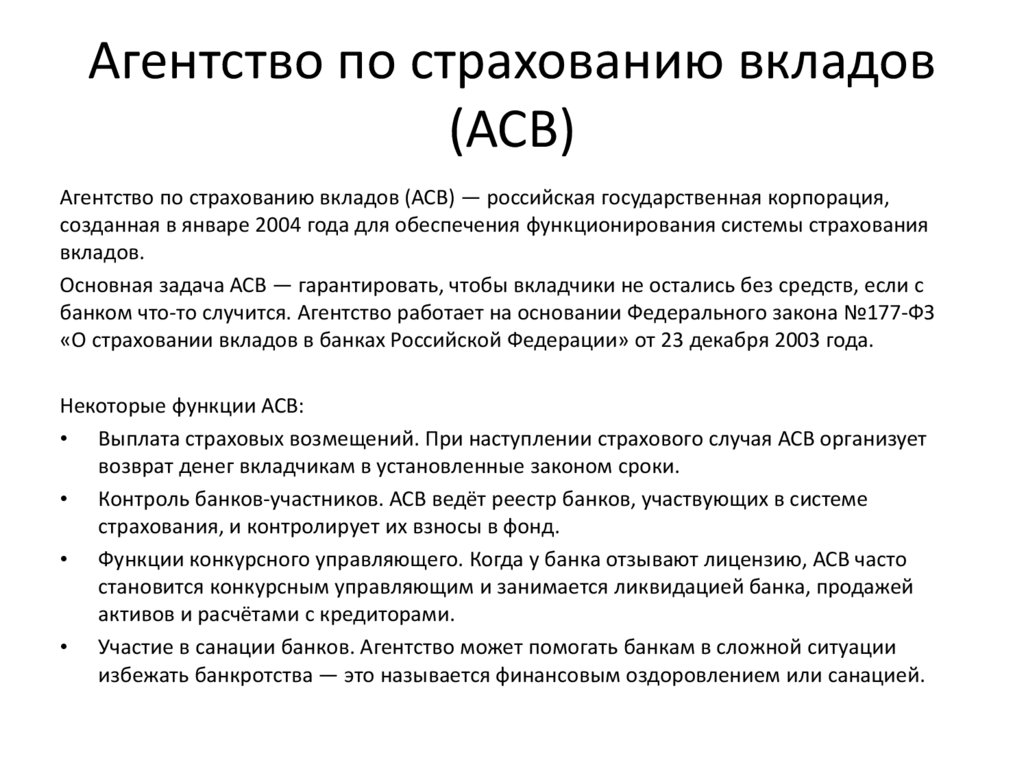 • Контроль банков-участников. АСВ ведёт реестр банков, участвующих в системе