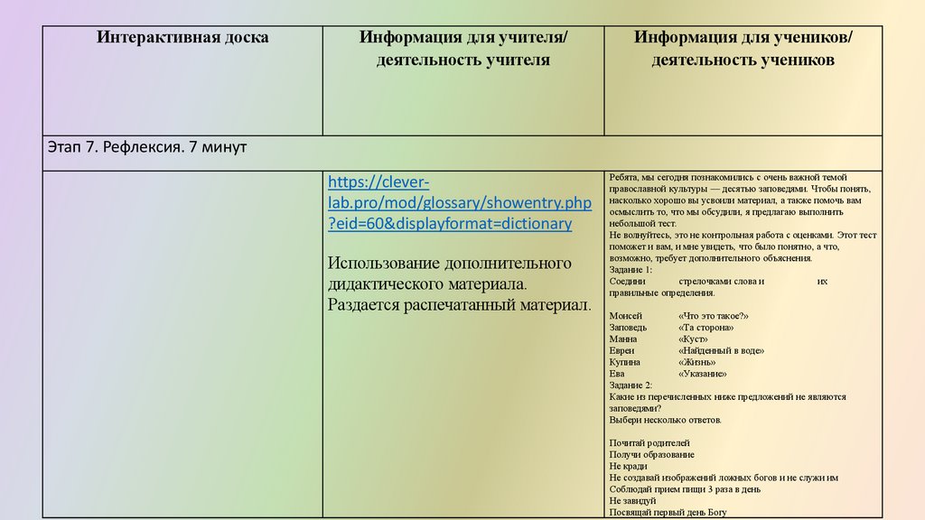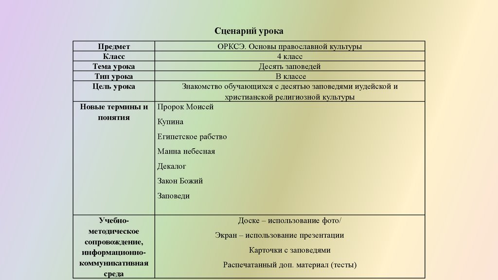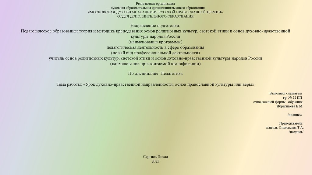 Тема работы: «Урок духовно-нравственной направленности, основ православной культуры или веры»