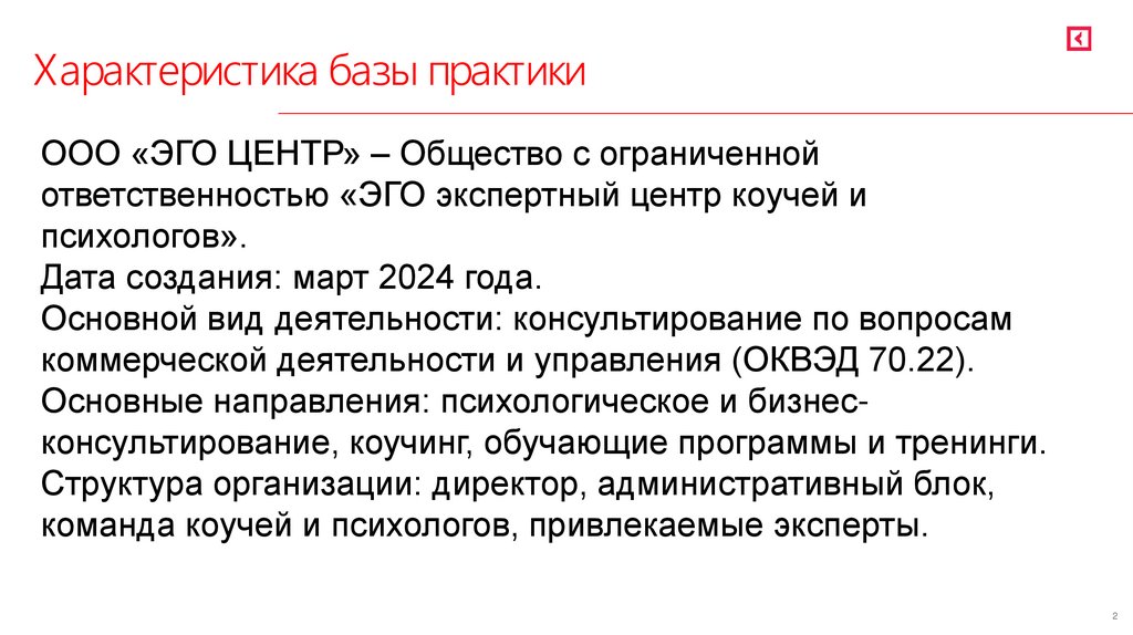 Характеристика базы практикиООО «ЭГО ЦЕНТР» – Общество с ограниченной