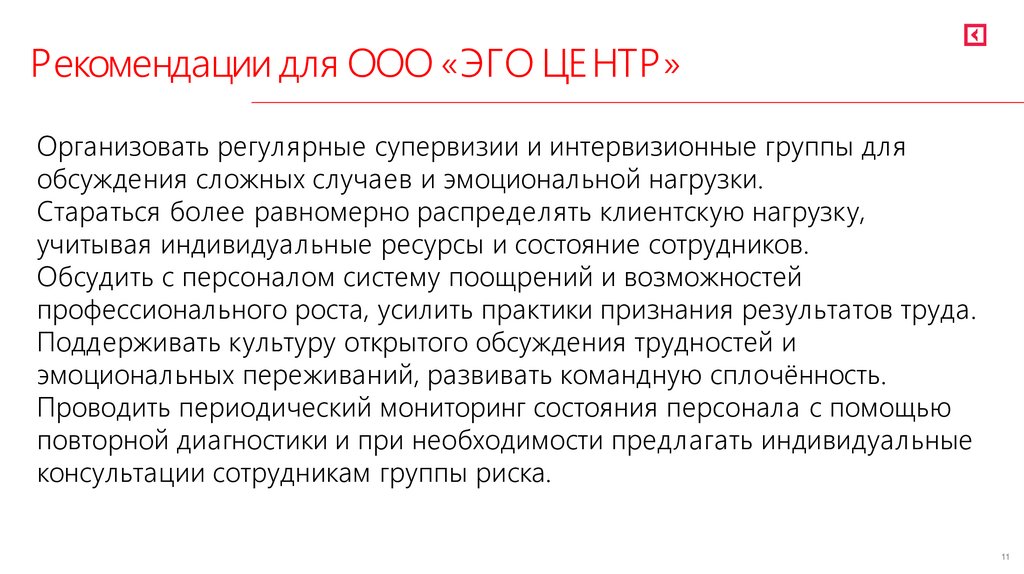 Рекомендации для ООО «ЭГО ЦЕНТР»Организовать регулярные супервизии и интервизионные группы для