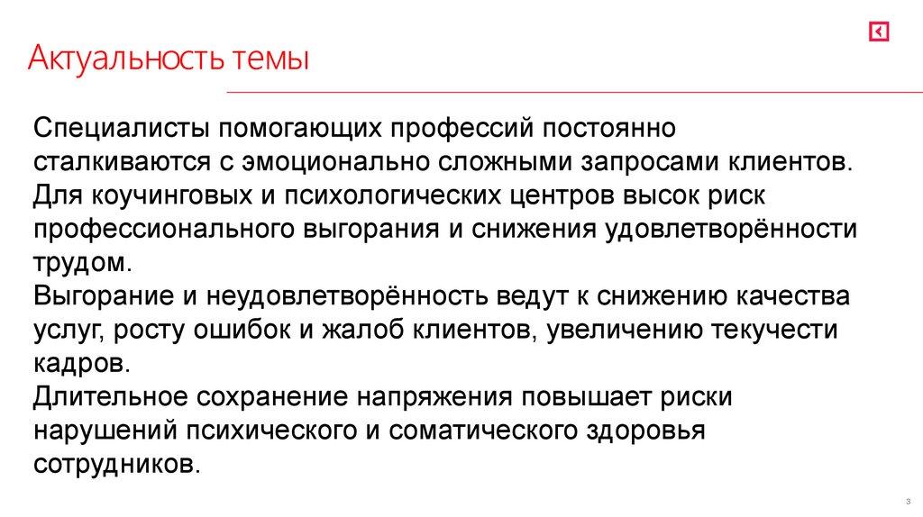 Актуальность темыСпециалисты помогающих профессий постоянно