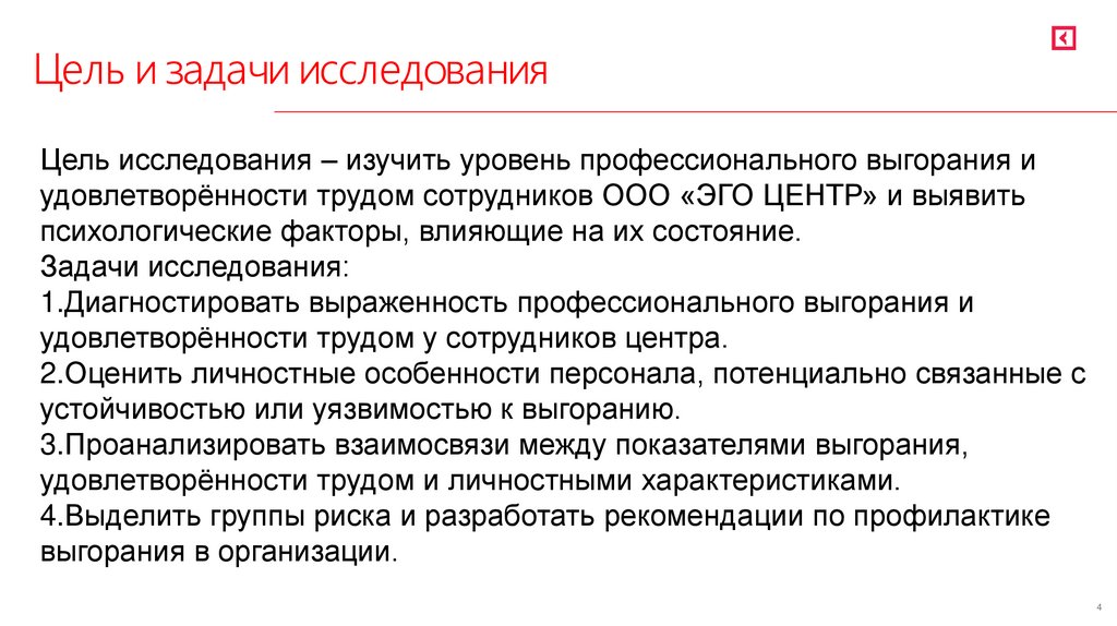 Цель и задачи исследованияЦель исследования – изучить уровень профессионального выгорания и