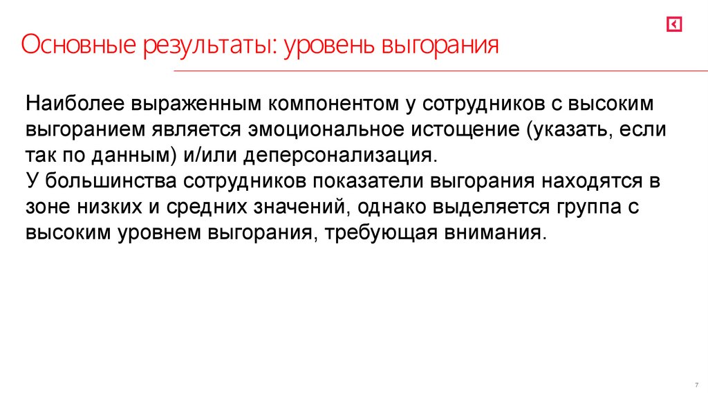 Основные результаты: уровень выгоранияНаиболее выраженным компонентом у сотрудников с высоким