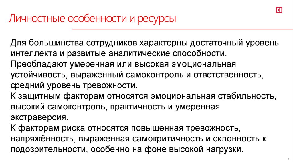 Личностные особенности и ресурсыДля большинства сотрудников характерны достаточный уровень