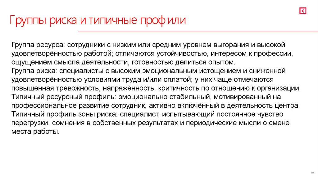 Группы риска и типичные профилиГруппа ресурса: сотрудники с низким или средним уровнем выгорания и высокой