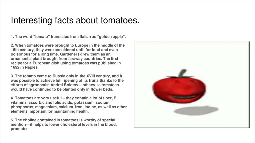 Interesting facts about tomatoes.1. The word "tomato" translates from Italian as "golden apple".