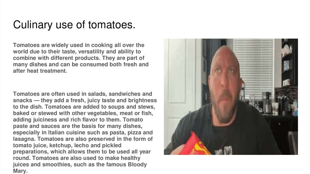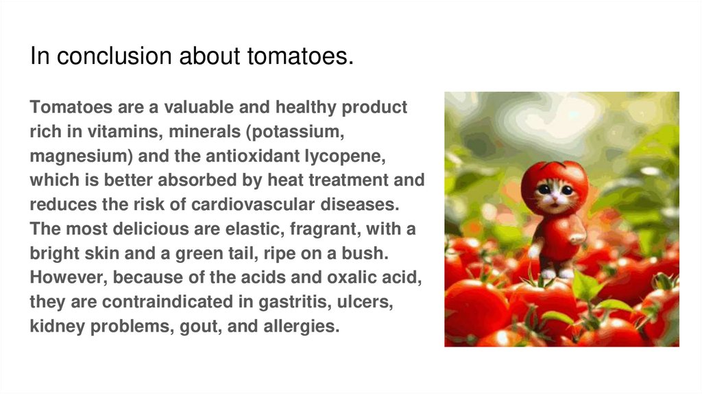 In conclusion about tomatoes.Tomatoes are a valuable and healthy product