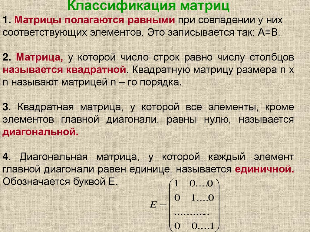 Классификация матриц1. Матрицы полагаются равными при совпадении у них