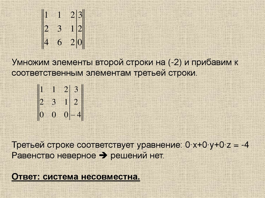 Третьей строке соответствует уравнение: 0∙x+0∙y+0∙z = -4