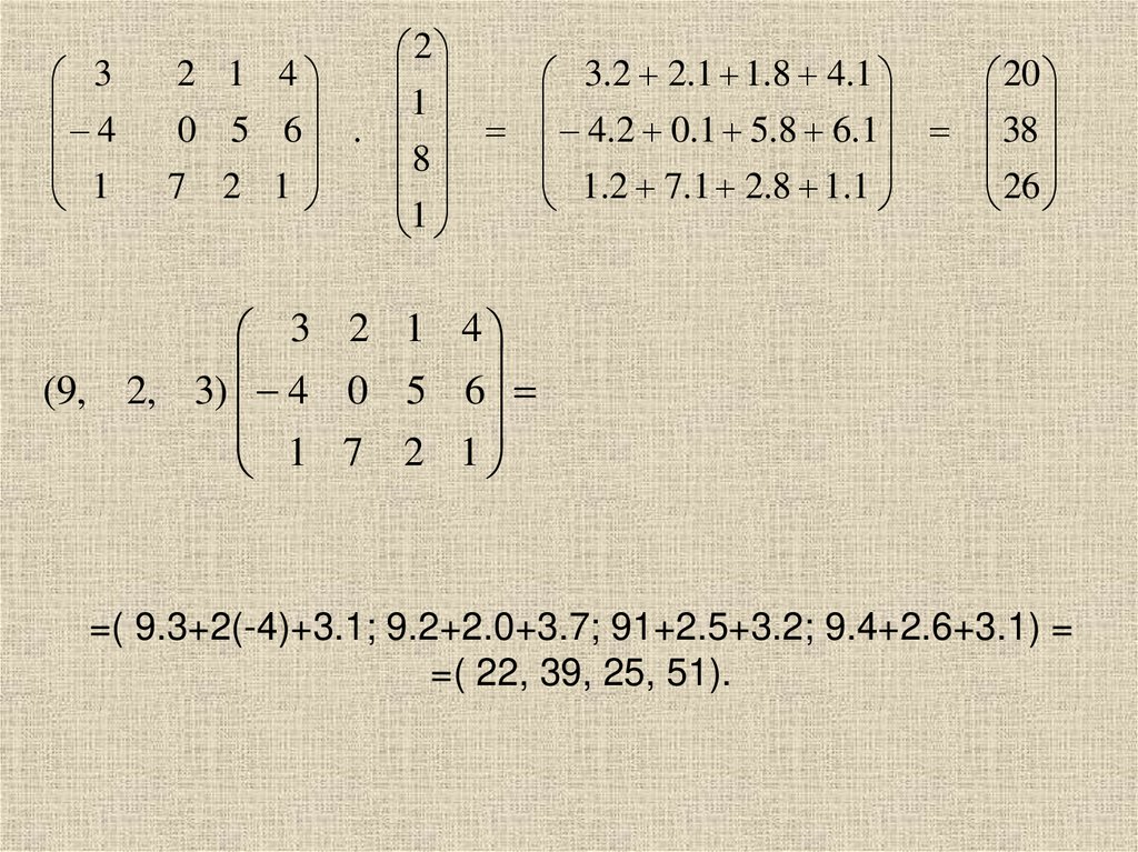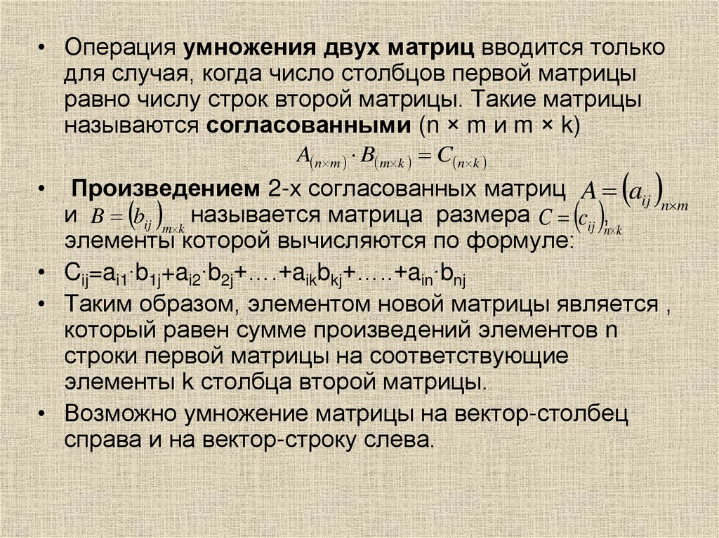 • Операция умножения двух матриц вводится толькодля случая, когда число столбцов первой матрицы