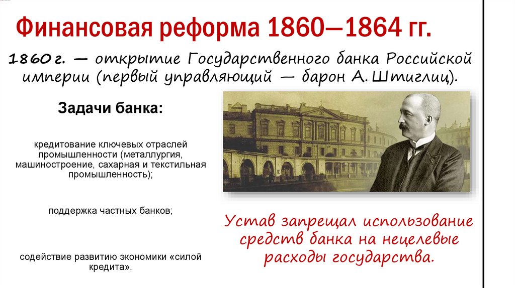Финансовая реформа 1860—1864 гг.1860 г. — открытие Государственного банка Российской