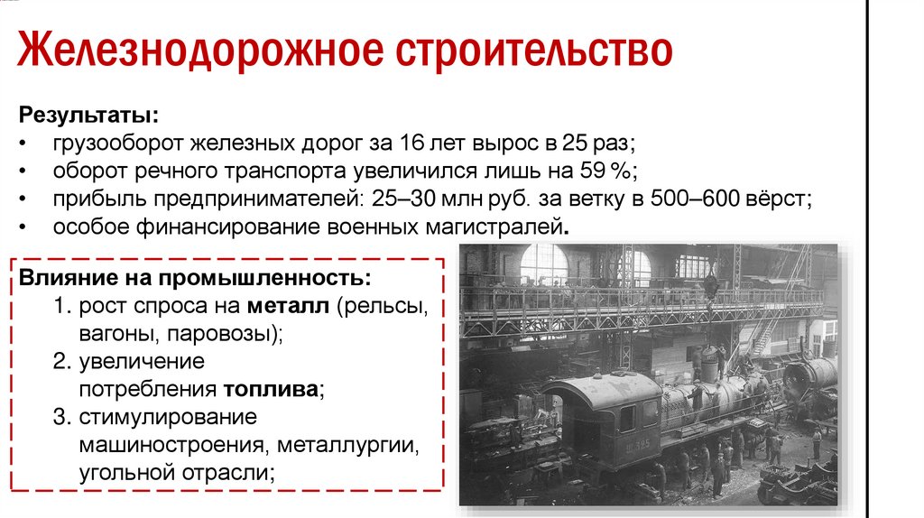 стимулировало высокий спрос на металл, уголь и паровозы.