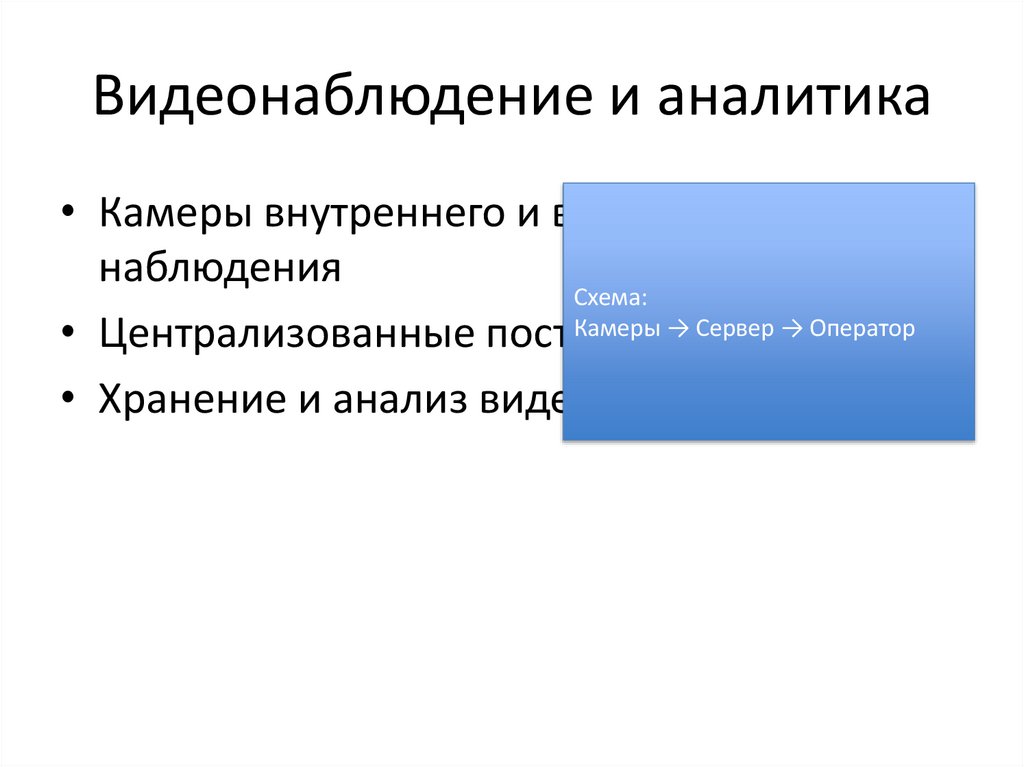 Видеонаблюдение и аналитика• Камеры внутреннего и внешнего