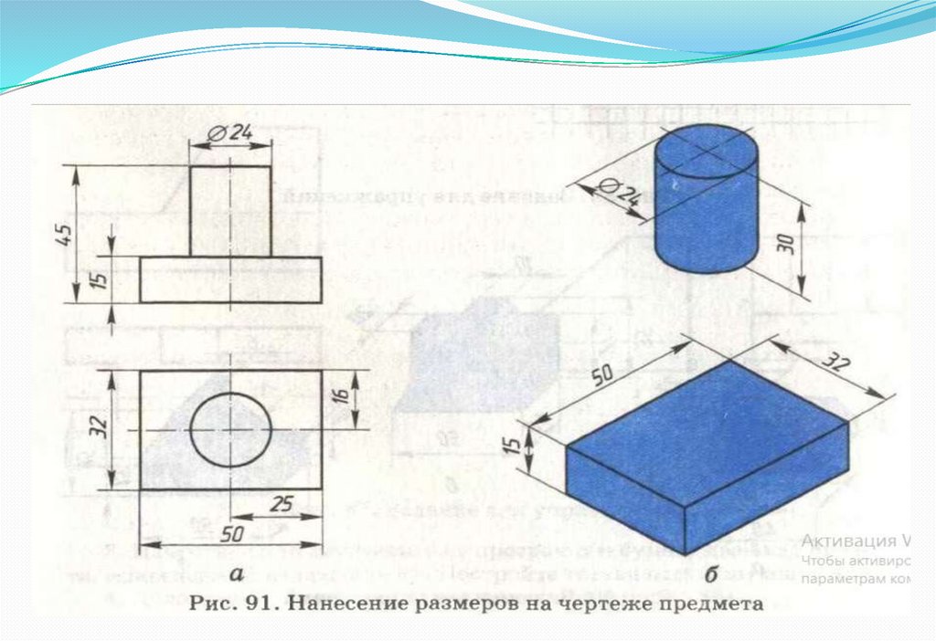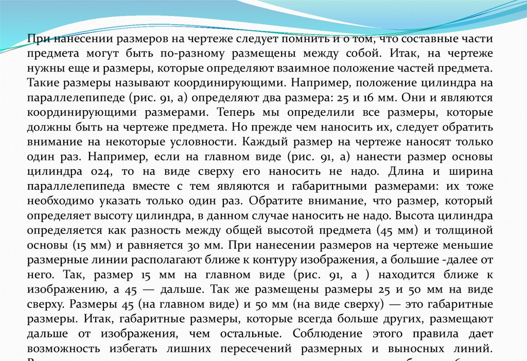 При нанесении размеров на чертеже следует помнить и о том, что составные частипредмета могут быть по-разному размещены между собой. Итак, на чертеже