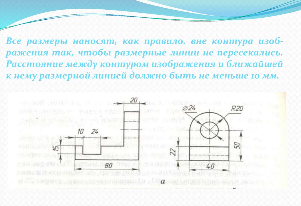 Все размеры наносят, как правило, вне контура изображения так, чтобы размерные линии не пересекались.Расстояние между контуром изображения и ближайшей