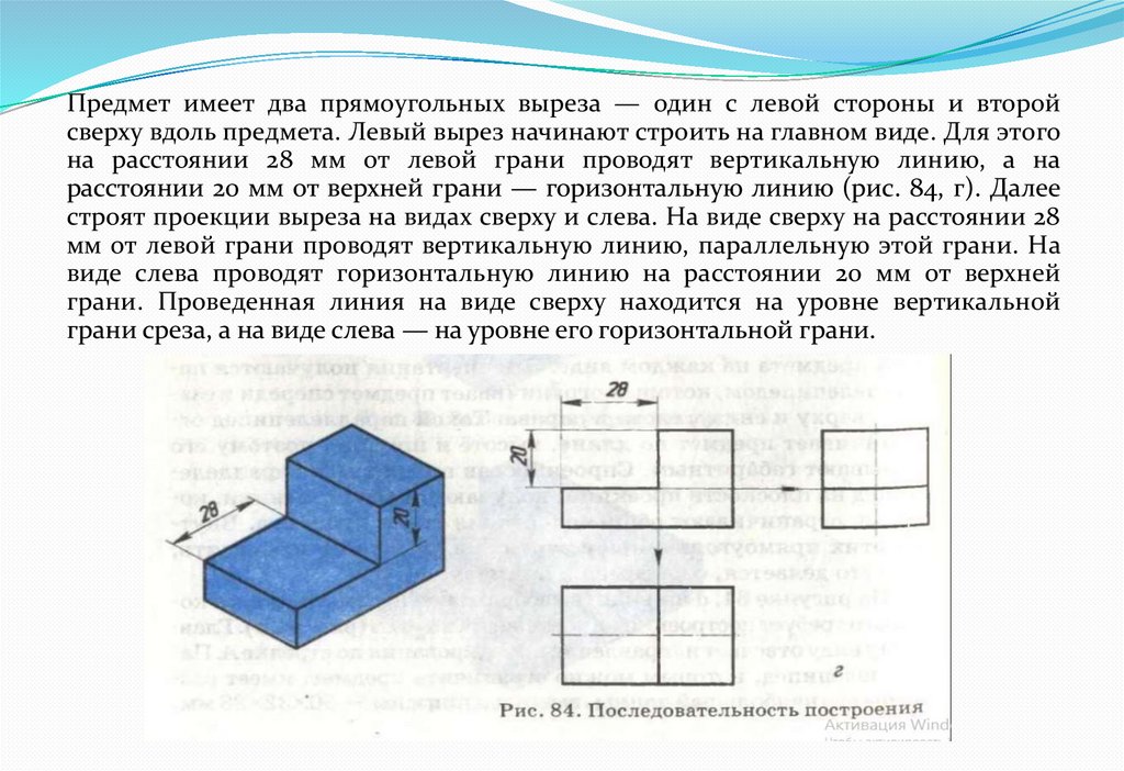 (рис. 84, д). На главном виде контур выреза (его нижняя грань) будет невидимой. Его
