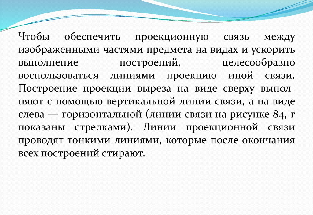 Построение проекции выреза на виде сверху выполняют с помощью вертикальной линии связи, а на виде