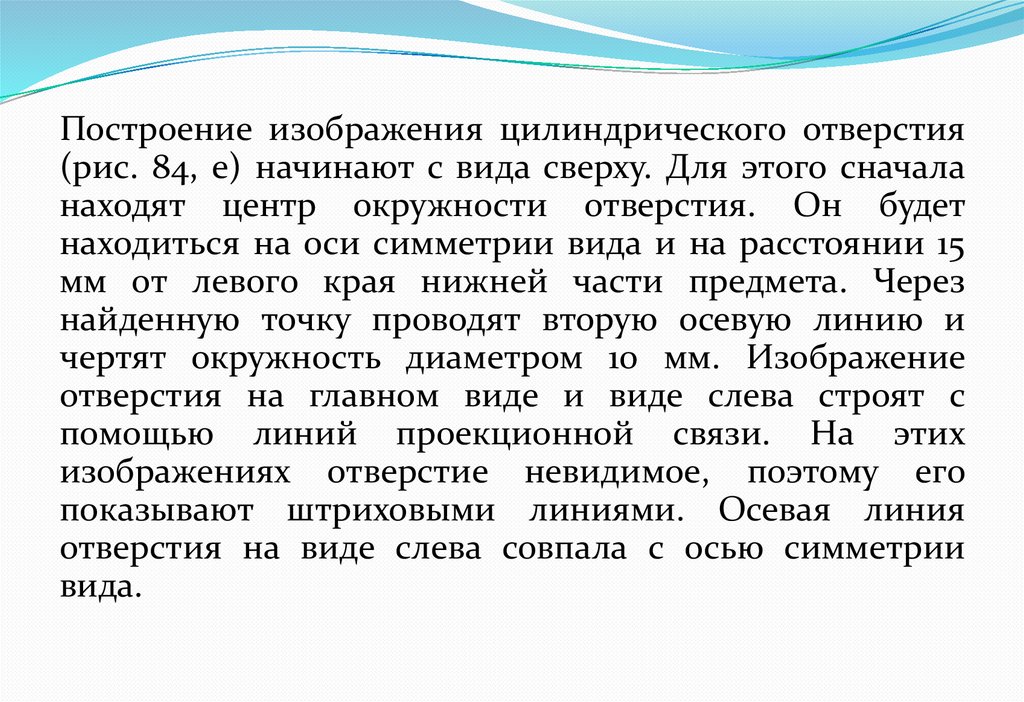 Построение изображения цилиндрического отверстия(рис. 84, е) начинают с вида сверху. Для этого сначала