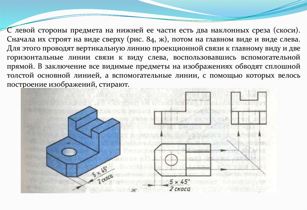 С левой стороны предмета на нижней ее части есть два наклонных среза (скоси).Сначала их строят на виде сверху (рис. 84, ж), потом на главном виде и виде слева.