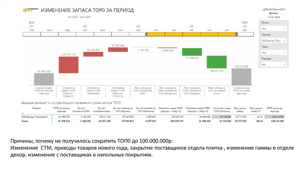 Причины, почему не получилось сократить ТОП0 до 100.000.000р:Изменение СТМ, приходы товаров нового года, закрытие поставщиков отдела плитка , изменение гаммы в отделе