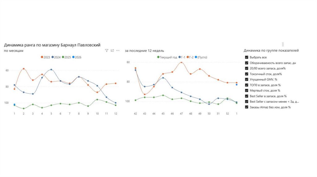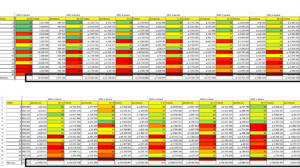 На еженедельной основе выгружала данные из отчет “Анализ гаммы в TOP0”, чтобы определить динамику по запасу в суммах DPAC в разбивкам по