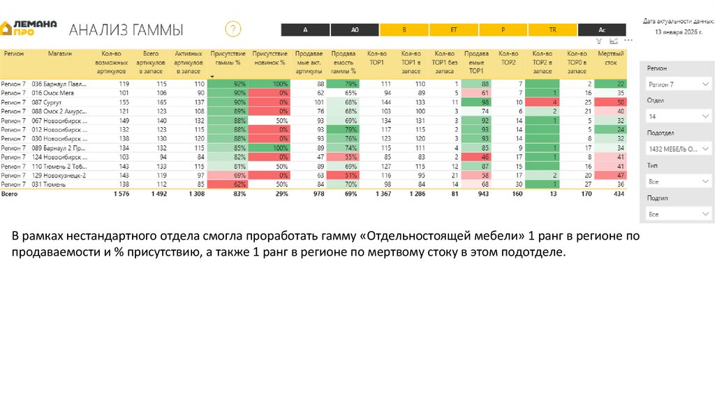 В рамках нестандартного отдела смогла проработать гамму «Отдельностоящей мебели» 1 ранг в регионе попродаваемости и % присутствию, а также 1 ранг в регионе по мертвому стоку в этом подотделе.