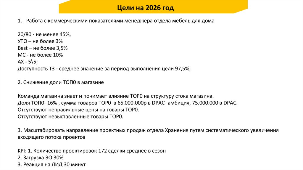 Цели на 2026 год1. Работа с коммерческими показателями менеджера отдела мебель для дома