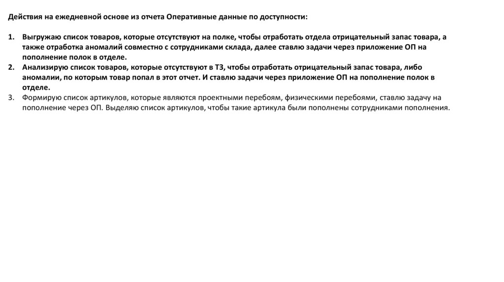 Действия на ежедневной основе из отчета Оперативные данные по доступности:1. Выгружаю список товаров, которые отсутствуют на полке, чтобы отработать отдела отрицательный запас товара, а