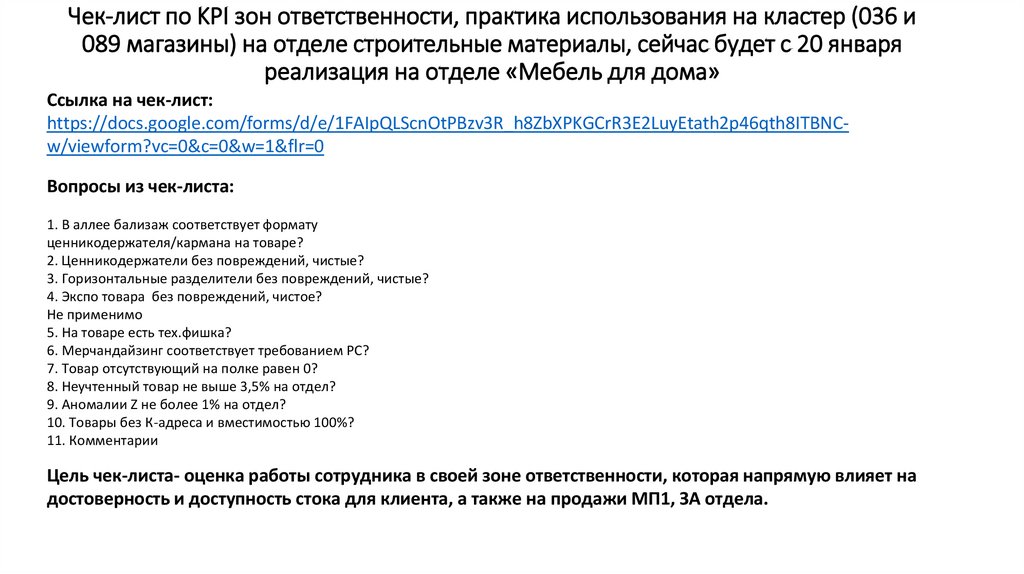 Чек-лист по KPI зон ответственности, практика использования на кластер (036 и089 магазины) на отделе строительные материалы, сейчас будет с 20 января