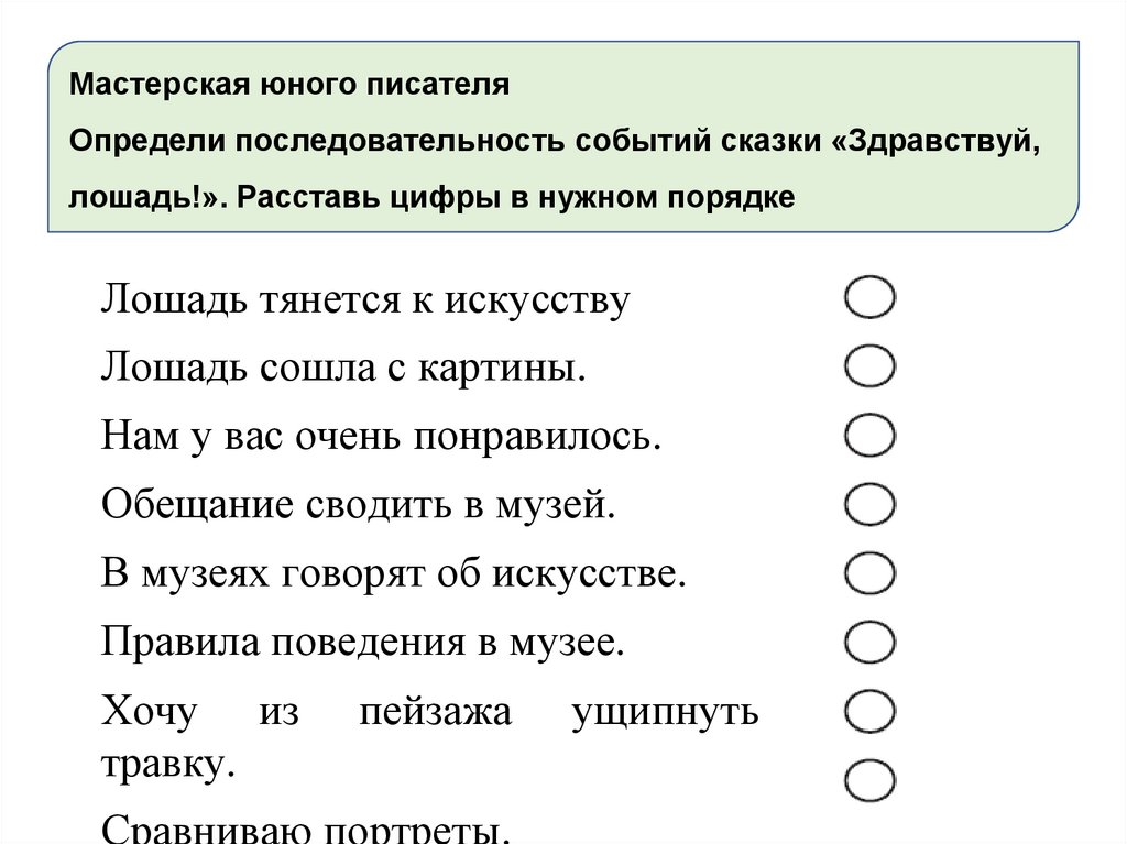 Мастерская юного писателяОпредели последовательность событий сказки «Здравствуй,