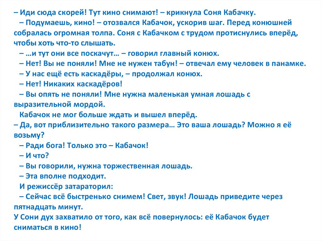 – Иди сюда скорей! Тут кино снимают! – крикнула Соня Кабачку.– Подумаешь, кино! – отозвался Кабачок, ускорив шаг. Перед конюшней