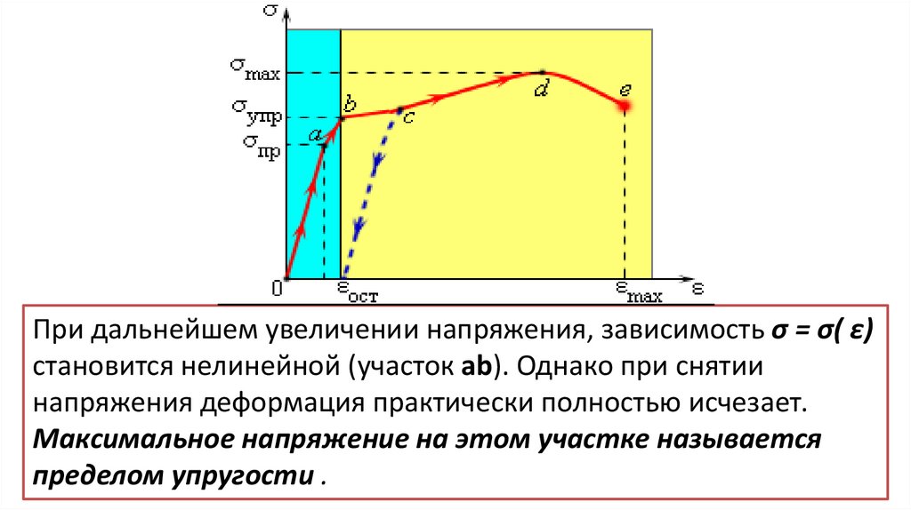При дальнейшем увеличении напряжения, зависимость σ = σ( ε)становится нелинейной (участок ab). Однако при снятии