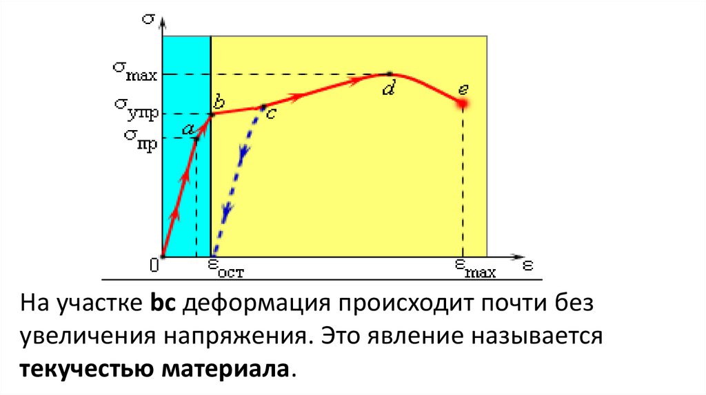 На участке bc деформация происходит почти безувеличения напряжения. Это явление называется