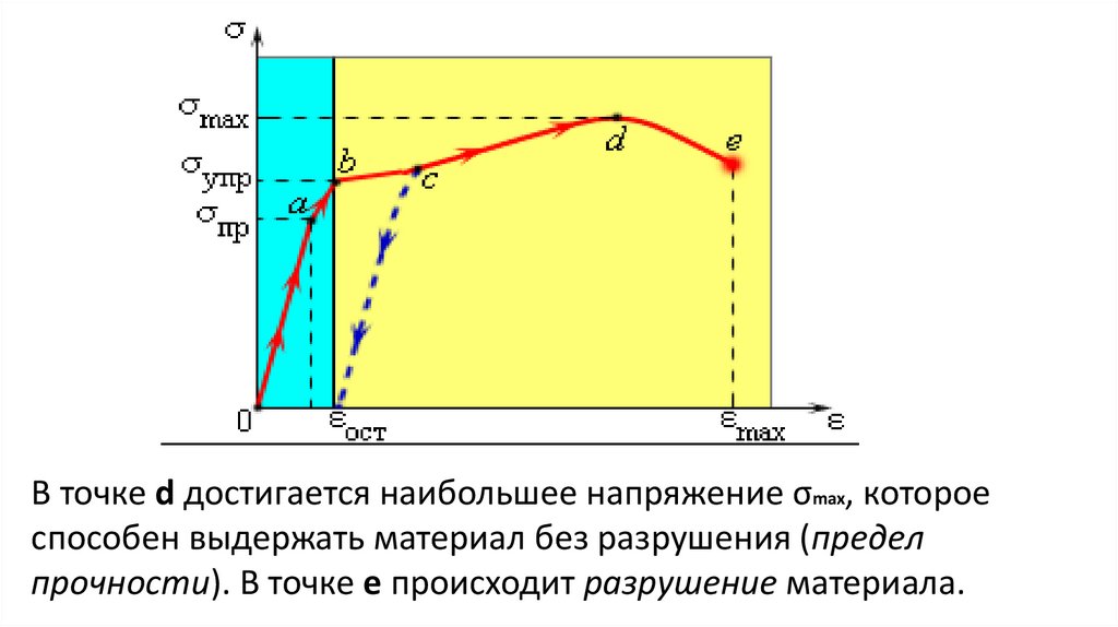 В точке d достигается наибольшее напряжение σmax, котороеспособен выдержать материал без разрушения (предел