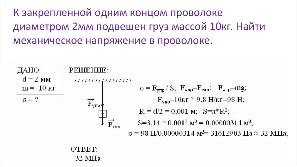 К закрепленной одним концом проволокедиаметром 2мм подвешен груз массой 10кг. Найти