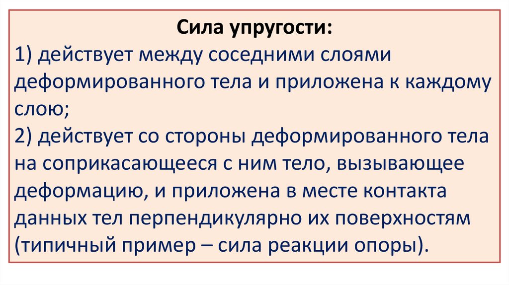 Сила упругости:1) действует между соседними слоями
