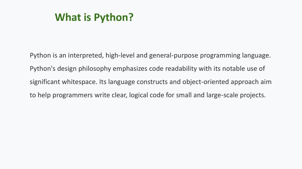 What is Python?Python is an interpreted, high-level and general-purpose programming language.