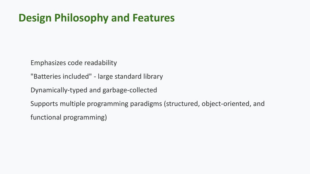 Design Philosophy and FeaturesEmphasizes code readability