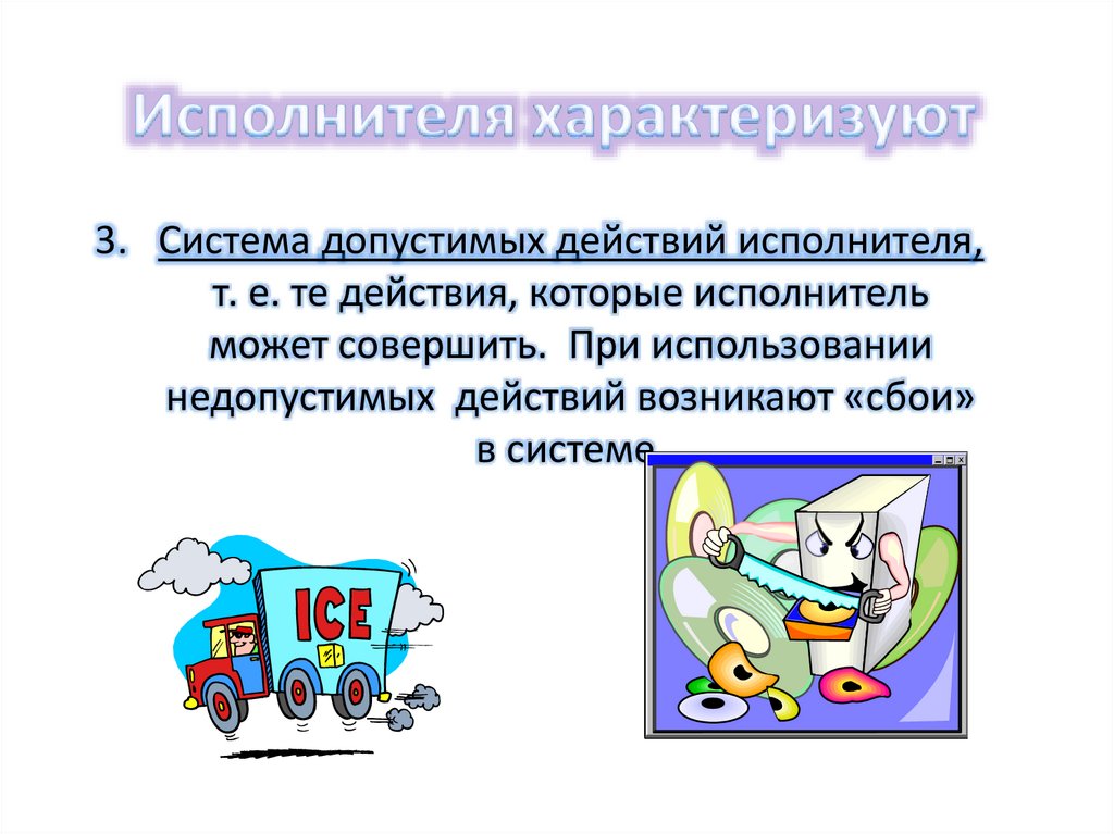3. Система допустимых действий исполнителя,т. е. те действия, которые исполнитель