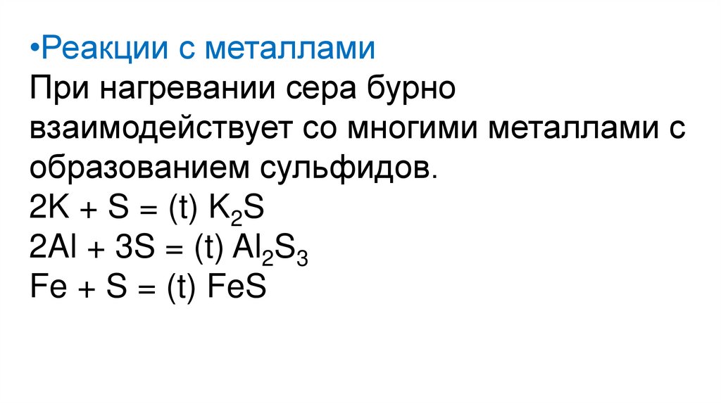 •Реакции с металламиПри нагревании сера бурно