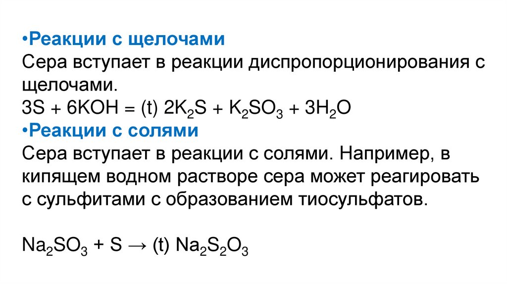 •Реакции с щелочамиСера вступает в реакции диспропорционирования с