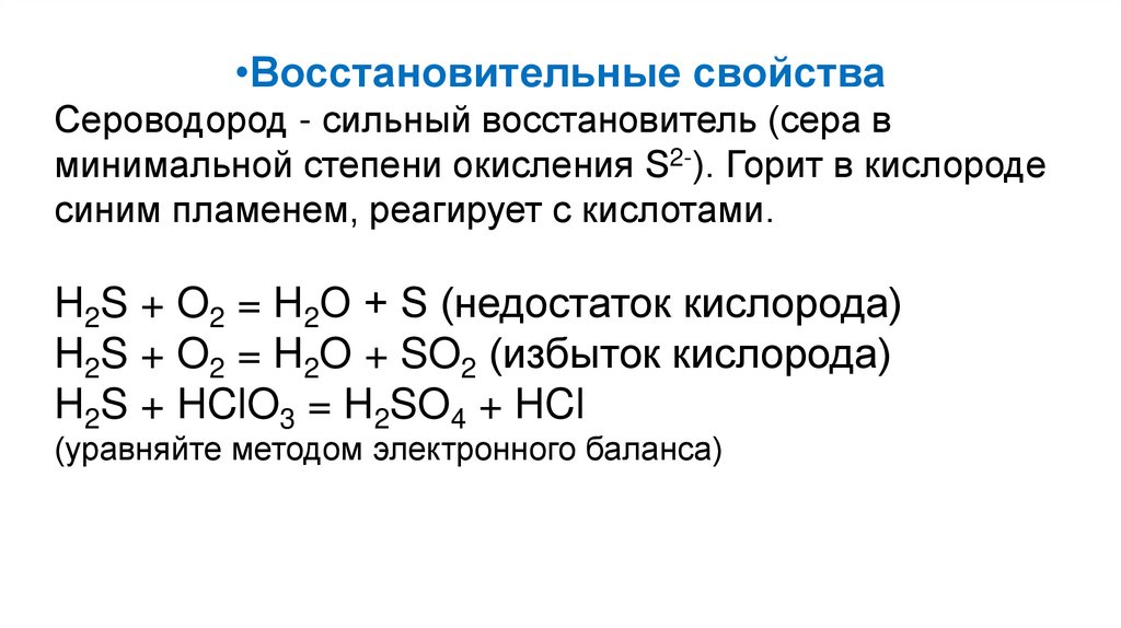 H2S + O2 = S + H2O (недостаток кислорода)